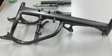 Powder Coating services are in house. We are able to powder coat motorcycle frames, swing arms, forks, etc. We powder coat many of the parts on our restorations. Powder coating is a very durable option for Honda Mini’s.